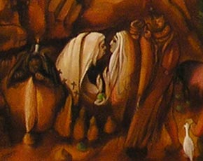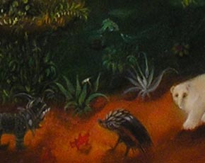 Le paysage est troué d'une mare à l'eau noire, la nuit a pénétré l'eau. L'étang garde en plein jour un peu de cette matière nocturne, un peu de ces ténèbres substantielles. Il devient noir marais où vivent les oiseaux monstrueux qui lancent leurs plumes comme des flèches ravageant les fruits du sol, se repaissant de chair humaine ; Bachelard parle aussi de la Mer des ténèbres – répandant l'effroi chez les marins. La profondeur qui donne à l'eau cette couleur d'encre est le réceptacle de nos terreurs nocturnes. Quand vient le jour dans une couleur cuivrée, rougeoyante, on constate la désolation, des corps sont étendus à même le rocher, un animal verdâtre est embroché sur une branche, un poisson monstrueux émerge d'un gouffre. En tête à tête deux personnages vêtus de blanc, conversent, dans leur dos, un homme grossièrement habillé s'appuie sur une pierre, une bougie allumée sur la tête, à l'opposé marche un humain avec chat-enfant accroché dans le dos, un gnome tient un cochon en laisse. Un animal en armure fait face à un porc-épic dressé sur ses deux pattes de poulet, un ourson promène sa blancheur. Du sommet d'une montagne se déverse une coulée de végétation, un fleuve de lave feuillue qui se termine par un visage grimaçant. Autant la densité terrestre est forte, autant le ciel prend une allure immatérielle, des nuages argentés viennent adoucir les pics acérés de la montagne.