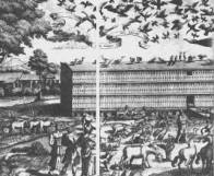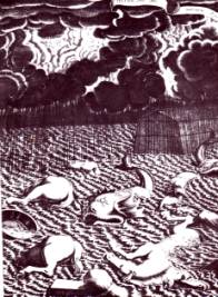 Dans une gravure, Kircher nous montre l'Arche comme une sorte de hangar monumental sous les nuées déchaînées, flottant parmi les cadavres d'hommes, de chevaux, de poissons, d'autres représentations dressent le catalogue de la création…