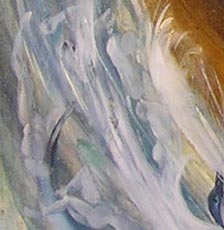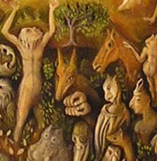 Dans la peinture de J.Hazera, le bruit et la fureur viennent battre les flancs de l'arche pendant qu'à l'intérieur, ouvert largement au regard par une vue plongeante, comme protégées par une cloche de verre invisible, les créatures vivent paisiblement. La nuit entoure un fragment de territoire clos, baigné d'une douce lumière. L'Arche est une coquille de noix ventrue, incertaine dans sa capacité à flotter entre une mer écumante et un ciel traversé de projectiles phosphorescents. Noé, debout, nu, les bras levés, invoque le ciel, prière ? colère ? ses compagnons de voyage s'accommodent très bien de la situation. Cette grosse forme ovoïde est réconfortante, elle semble en gestation de ses occupants. On assiste à leur vie nonchalante, les uns se dégourdissent les pattes, les jambes, les bras, les autres somnolent, dorment profondément, contemplent le spectacle, aucun signe d'inquiétude, l'arche bombée dans sa lumière dorée berce sa création au milieu de la terreur. Punition pour ceux qui n'ont pas eu la chance d'être du bon côté, étrave d'une nef des fous qui fend sa route parmi les sacrifiés, nantis écrasant le tiers-monde…. L'art est le plus tragique et le plus utile de nos jeux quand il s'agit de danser au bord de l'abîme ou de le recouvrir de fleurs.