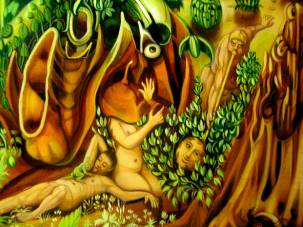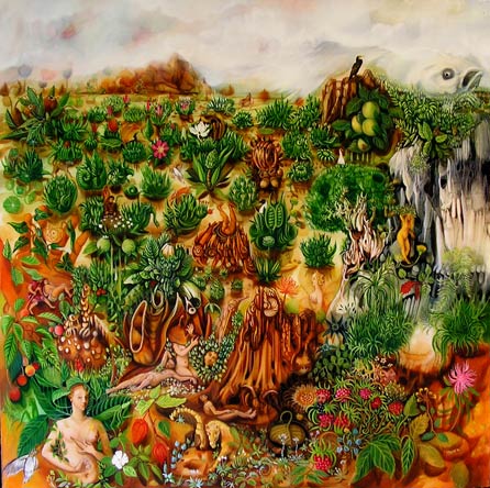 Il n'est pas sûr que le potager soit constitué de plantes nourricières, vénéneuses ? ces plantes fleurissent, portent des fruits. Taillées dans la masse elles poussent en buissons, séparées les unes des autres sur un sol lisse, lumineux, liquide peut être, se soulevant par endroit en rochers, plantes, animaux…incertitude. Le buste d'une jeune femme émerge au pied d'une roche blanche qui se prolonge en arbre dont les branches se terminent en bras humains, cous et becs d'oiseaux. Dans l'anfractuosité d'une falaise finement ouvragée en voile de roche, une nymphe dorée s'adresse à une fleur. Au centre du tableau un animal à deux têtes ingérant un homme en son dos, jambes dressées vers le ciel, bras servant de pattes. La chimère n'est pas complète, les cuisses de l'homme se transforment en deux visages coiffés de mollets et de pieds. Plus bas un souffleur de trompe descendu du plafond de la Sixtine, non pour claironner le jugement dernier mais pour gonfler comme une baudruche la tête de la Joconde. Au premier plan, allusion à l'école de Fontainebleau, Diane de Poitiers dans un écrin de feuillages et de fleurs. Remontant sur le bord du tableau, une main ouverte dissimulée, brouillée par les volutes du lierre, le feuillage d'un cerisier, paume recueillant berger et nymphe du Titien. Prés du visage sphérique de la Joconde, un femme nue à sa toilette se contemple dans un miroir circulaire, elle tente de se coiffer ? sa tête est couverte d'un capuchon qui évoque celui que le fauconnier ajuste sur la tête de l'oiseau. A cet aveuglement répond une pupille suspendue à l'aisselle d'une feuille. Un homme alangui, appuyé sur le flanc de cette femme tire la langue à un crapaud. Renommée, vanité, beauté cachée, aveuglement, narcissisme, déformation d'une œuvre, inflation du langage, artifice, vacuité...