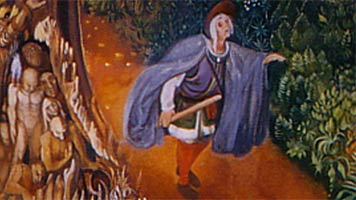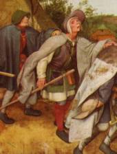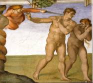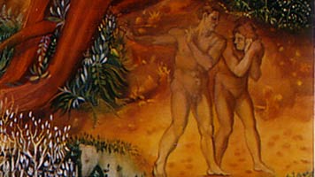 Adam et Eve semblent vouloir quitter la scène du tableau. Chassés du paradis ils se protégeaient du glaive de l'ange, depuis ils sont tombés sur terre, le geste est conservé pour signifier autre chose, le prix à payer pour accéder à la connaissance, à la condition humaine, est lourd, rien n'est prévu pour la joie rayonnante, ils cherchent la sortie. Derrière eux, une forêt inquiétante traversée d'un sentier, à l'entrée une forme, mi-arbre, mi-chat écorché, se dresse comme un totem maléfique, atlas décharné, vacillant. Le premier plan dans une grande courbe nous livre brutalement un cadavre en train d'être digéré par des rameaux secs d'arbustes, des personnages énigmatiques s'abritent dans un arbre creux. L'aveugle de Bruegel la main tendue vers le vide, humant l'air de sa nuit avance dans la même direction qu'Adam et Eve, leurs deux bras esquissent une ligne invisible allant du paradis perdu à l'incertitude du prochain pas. Le tableau a un centre inondé d'une lumière tombant de la frondaison, lieu chimérique ou source vitale, Hercule et