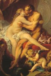 Omphale sont enlacés. Nous retrouvons le leitmotiv du balancier mis en mouvement dans le tableau des trois philosophes, entre la vie et la mort. Cette figure de l'éros n'est pas aussi simple qu'il y paraît, un rougeoiement préoccupant s'est allumé en arrière plan.